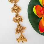 Lakshmi Devi Jadabilla is a meticulously crafted piece of bridal jewellery, embodying traditional elegance and spiritual symbolism. Designed to enhance bridal attire, this ornament features intricate detailing that reflects the grace and auspiciousness associated with Goddess Lakshmi. Perfect for completing a regal bridal look, it offers both visual charm and cultural significance, making it an essential addition to any bride’s collection. Expertly designed to blend heritage artistry with timeless beauty, this Jadabilla elevates your wedding ensemble with sophistication and divine allure.