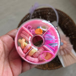 This Donut kids hair combo offers a versatile collection of hair accessories designed for comfort and style. It includes soft cloth hair bands, small hair clips, and a large netted hair band, all thoughtfully packaged in a Donut-themed box. Perfect for keeping hair neatly in place while adding a charming touch, this combo suits various hairstyles and occasions, ensuring both practicality and playful appeal for children.